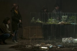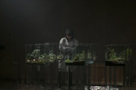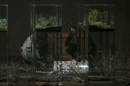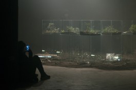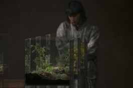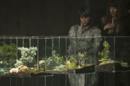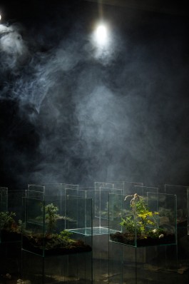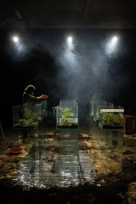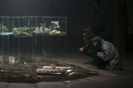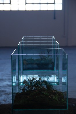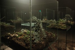En el centro de un galpón enorme hay una isla de tierra. 45 kilos de tierra, parlantes que suenan y dialogan con el espacio vacío. Un coro de murmullos. Suena una colección de sueños de los artistas participantes de la Bienal. La isla está cubierta por un bosque de árboles secos en miniatura. Entre los árboles se ven algunos edificios abandonados, todavía encendidos. Sobre este micro mundo, a 80 cm de altura, vemos nueve vitrinas a escala real que contienen naturaleza detenida.