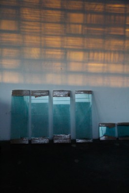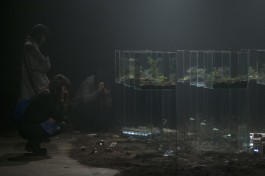 In the center of a big warehouse there is a dirt island. 45 kg of dirt, speakers sound and dialogue with the empty space. A choir of whispers. A collection Bienal’s artist dreams sounds. The island is covered by a forest of dry miniature trees. Between the trees some buildings could be seen, abandoned, with their lights still turned on. Above this micro-world, 80cm high nine real scale vitrines containing stopped nature could be seen.