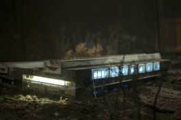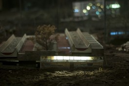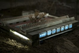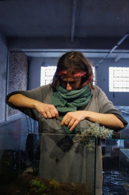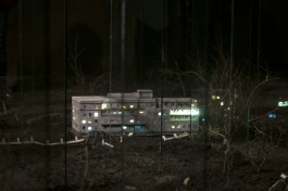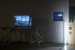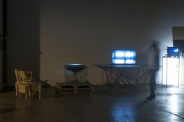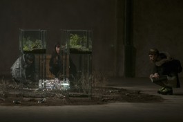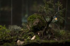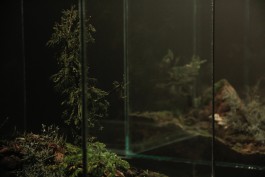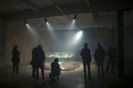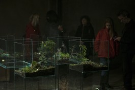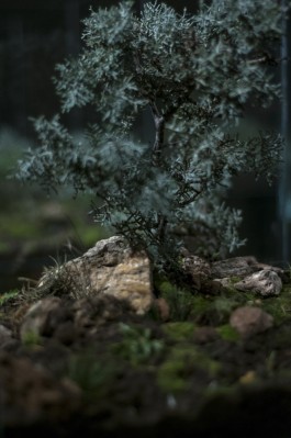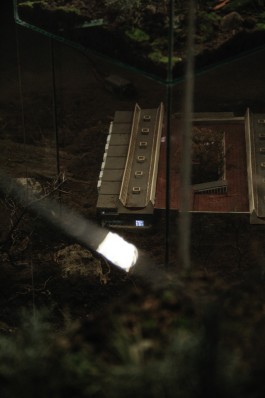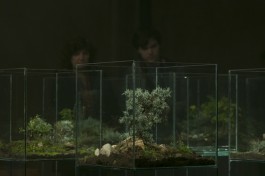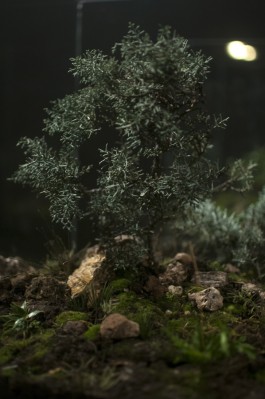 On the center of the hall there’s a dirt island. 45 kg of dirt, speakers that sounds and converse with the empty space. A choir of whispers. A dream collection of the participating artists of BP.17 sounds. The island is covered by a miniature dried up forest. Between the trees some old abandoned buildings could be seen, still enlightened. Above this micro-world, 80 cm high, we see nine real scaled vitrines containing stopped nature.