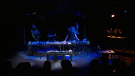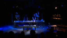 From a scenic device, composed of stations that function as laboratories for the extraction of natural sounds, automated mechanisms put into operation organic material, such as plants, or inorganic material, such as stones, turning them into oscillators. The duo, immersed in this sound and visual landscape, manipulates these mechanisms in real time and develops a dialogue between written composition, improvisation and sound art.
