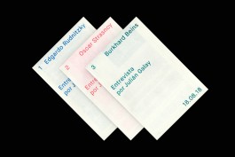 Project of interviews on the creative process and composition made by Julián Galay and edited by Ninja Papel Editora. This first collection is made up of 5 fascicles that focus on artists from different disciplines working around sound. The interviewees are: Edgardo Rudnitzky (Argentina / Germany), Oscar Strasnoy (Argentina / Germany), Burkhard Beins (Germany), Liz Allbee (United States) and Lucie Vitkova (Czech Republic).